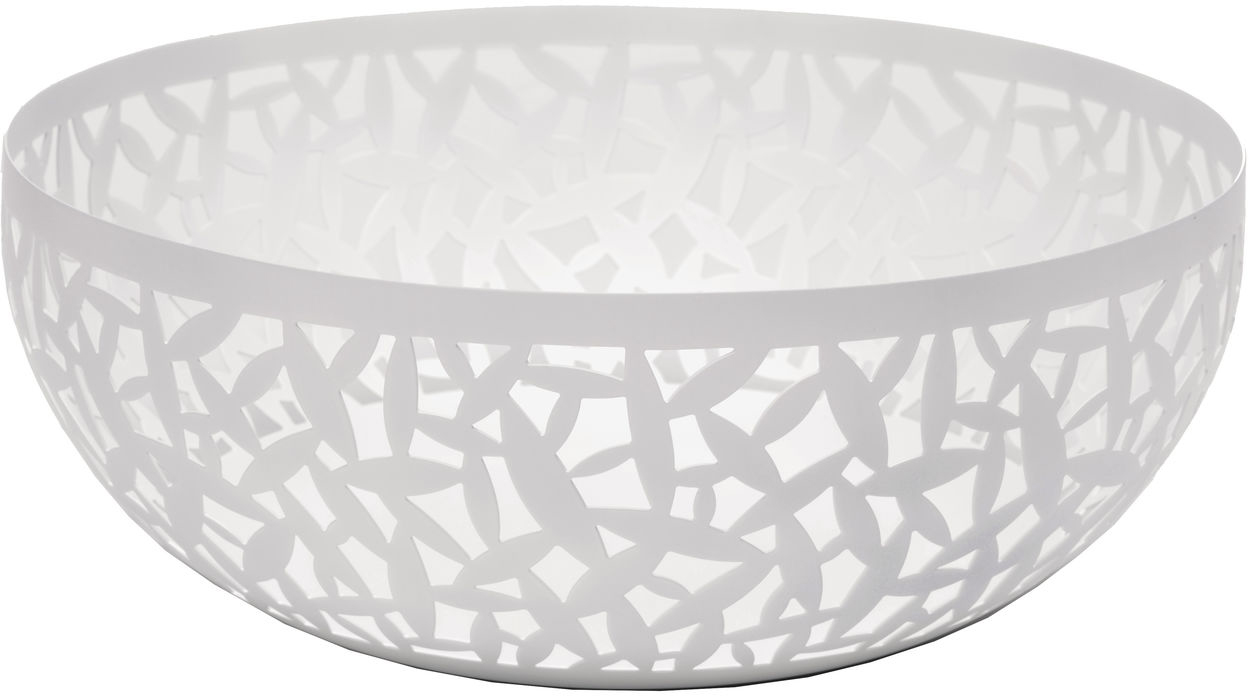 Obstkorb rund aus Edelstahl 18/10 glänzend poliert mit lasergeschnittenem durchbrochenem Dekorrand glänzend poliert. Das Dekor "CACTUS!" ist seit 2000 für unterschiedliche Arten von Tabletts Körben und Küchengegenständen erhältlich. Obstschale aus Stahl epoxidharzlackiert Super White.
