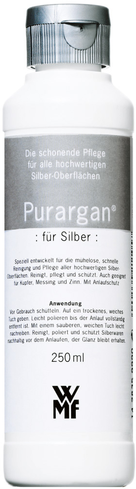 Seit über 160 Jahren lebt die Marke WMF eine starke Tradition. Sie ist international präsent, setzt Maßstäbe und wirkt mit zahlreichen Innovationen im Markt als wichtiger Impulsgeber. Sie begleitet Genießer durch den Alltag mit qualitativ hochwertigen, funktionalen und formschönen Produkten rund um Tisch und Küche, die einem hohen Designanspruch genügen. Purargan pflegt Ihr Silber- oder versilbertes Besteck sehr gründlich und erzielt einen leichten Anlaufschutz. Auch Kupfer, Messing und Zinn kann mit der feinen Emulsion gereinigt werden.